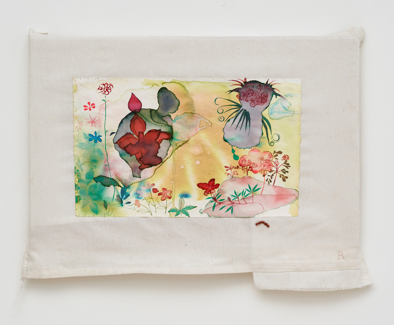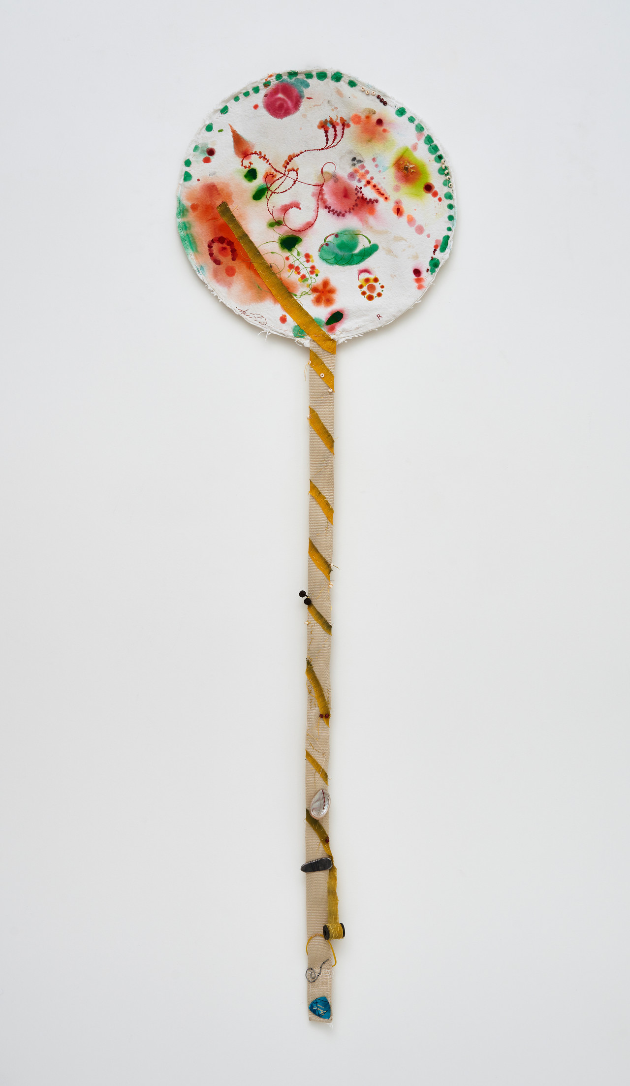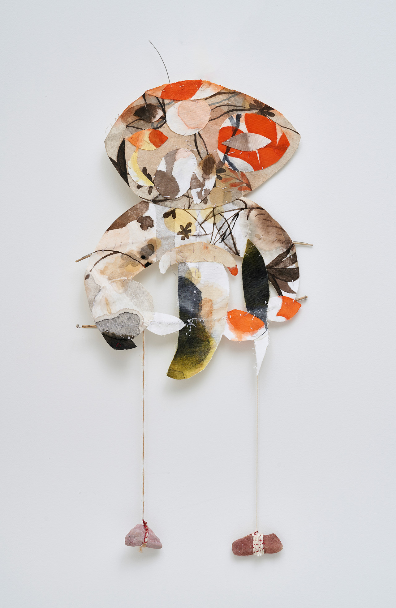 김정아의 작업은 작가가 일상과 주변에서 발견하고 수집한 사물들에서 출발한다. 천 조각, 종이, 실꾸러미, 비즈, 나뭇가지, 철사와 같은 요소들은 특정한 목적을 위해 준비된 재료라기보다, 이미 사용되었거나 버려졌거나, 오랜 시간 보관되어 온 것들이다. 작가는 이러한 것들을 다시 선택하여 염색하고, 꿰매고, 엮어 새로운 구조를 형성해 나간다. 종이는 천 위에 부착되어 또 다른 표면을 형성하고, 실은 서로 다른 요소들을 연결하며, 나뭇가지와 철사는 화면의 구조를 지지하는 동시에 내부와 외부를 잇는 매개로 작용한다.