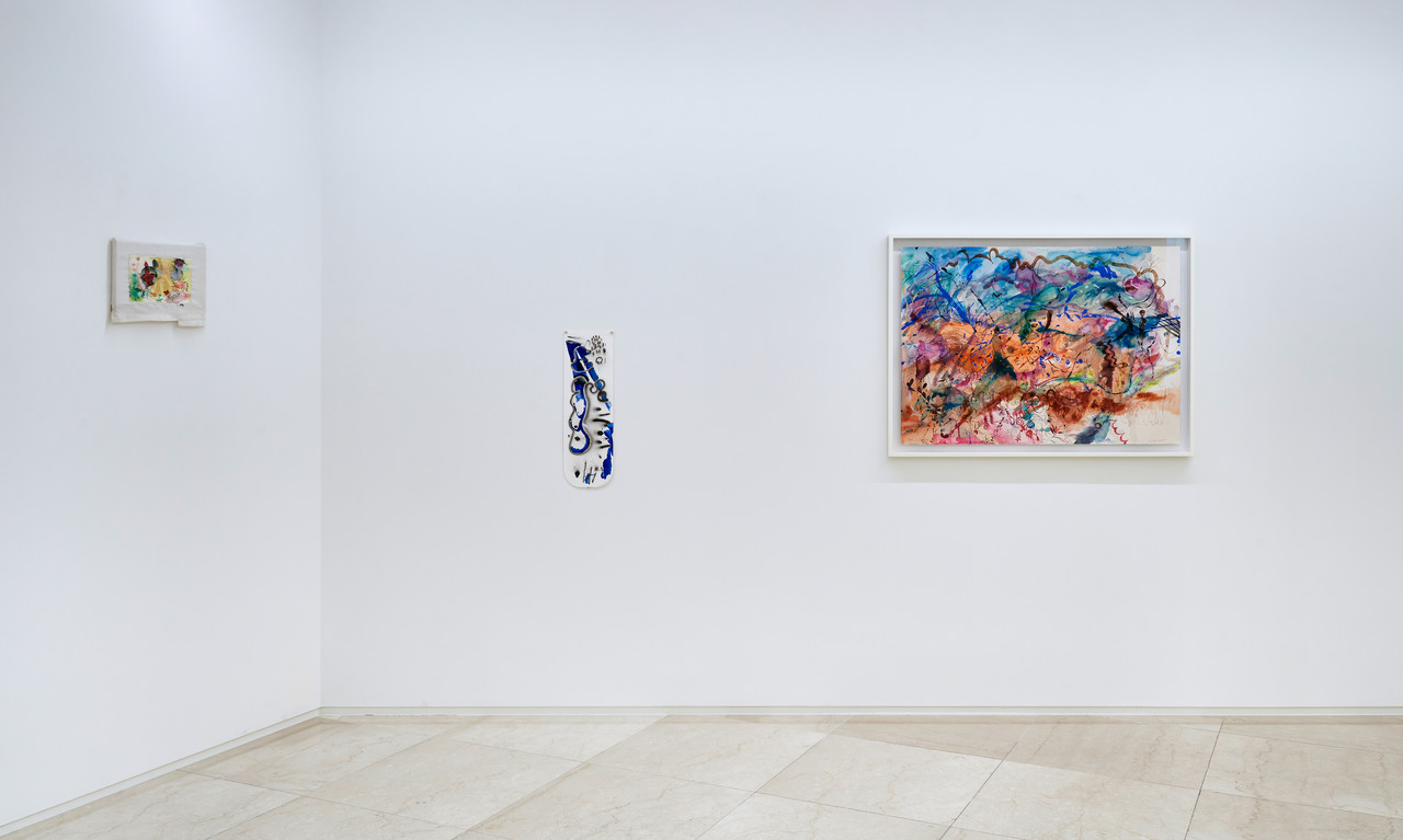 유창창은 보다 명확한 형상을 전면에 드러내면서도, 그 형상이 하나의 존재로 확정되는 것을 끊임없이 유예한다. 화면에 등장하는 얼굴은 단일한 형상으로 닫히지 않는다. 얼굴의 윤곽 안에는 또 다른 인물의 실루엣이 겹쳐 있으며, 그 형상들은 눈과 코, 입을 이루는 동시에 독립된 존재처럼 남는다. 하나의 표정은 여러 형상이 잠시 겹쳐 형성된 구조에 가깝고, 그 결합은 완전히 봉합되지 않는다. 인물의 뒤편에는 특정한 장소로 확정되지 않는 공간이 펼쳐진다. 그것은 하늘처럼 보이기도 하고, 바다의 수평선이나 눈 덮인 들판, 혹은 사막과 같은 풍경으로 읽히기도 한다. 자동차나 사과, 뼈를 연상시키는 빵과 같은 사물들은 배경에 놓여 장면의 단서처럼 작용하지만, 화면을 하나의 서사로 고정하지는 않는다. 그의 회화는 설명되기보다는 감각으로 남는다.